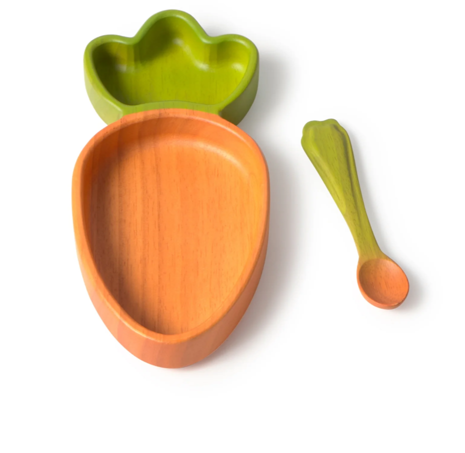 O conjunto prato e colher Cathy the Carrot é o mais estiloso para bebés à mesa. O conjunto é composto por um prato e uma colher feitos à mão em madeira de seringueira (Hevea), dando uma segunda vida às árvores que nos deram nossos brinquedos de borracha. A alternativa mais segura para crianças, pois é livre de ftalatos.